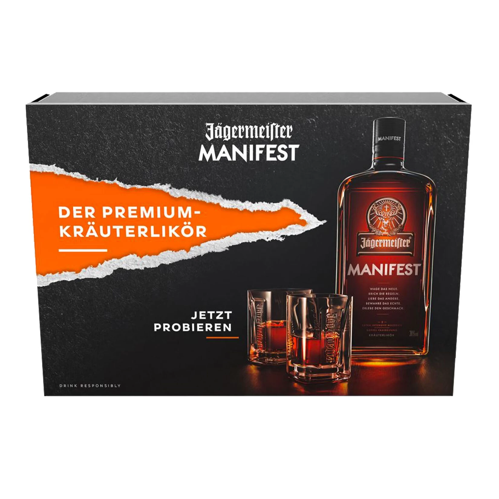 - Jägermeister MANIFEST Set mit Gläsern – 1 x 0,5l Superpremium-Kräuterlikör 38% Vol. inkl. 2 x Manifest Glas 4cl – auch für den Whiskey Liebhaber – limitierte Geschenk Box