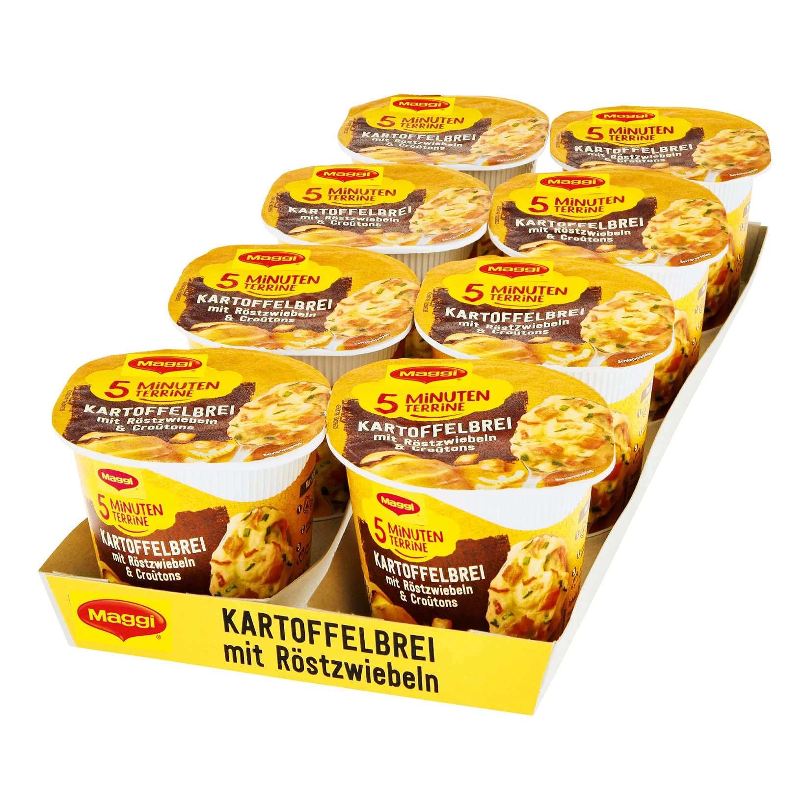 Mit der MAGGI 5 Minuten Terrine Kartoffelbrei mit Röstzwiebeln & Croutons haben Sie innerhalb weniger Minuten einen warmen Snack, der jedes Kartoffelpüree Herz höher schlagen lässt. Unschlagbar lecker ist das cremige Kartoffelpüree mit gerösteten Zwiebeln und knusprigen Croutons. Schnell und unkompliziert in nur 5 Minuten zubereitet. Der Klassiker für zuhause, unterwegs oder im Büro.
