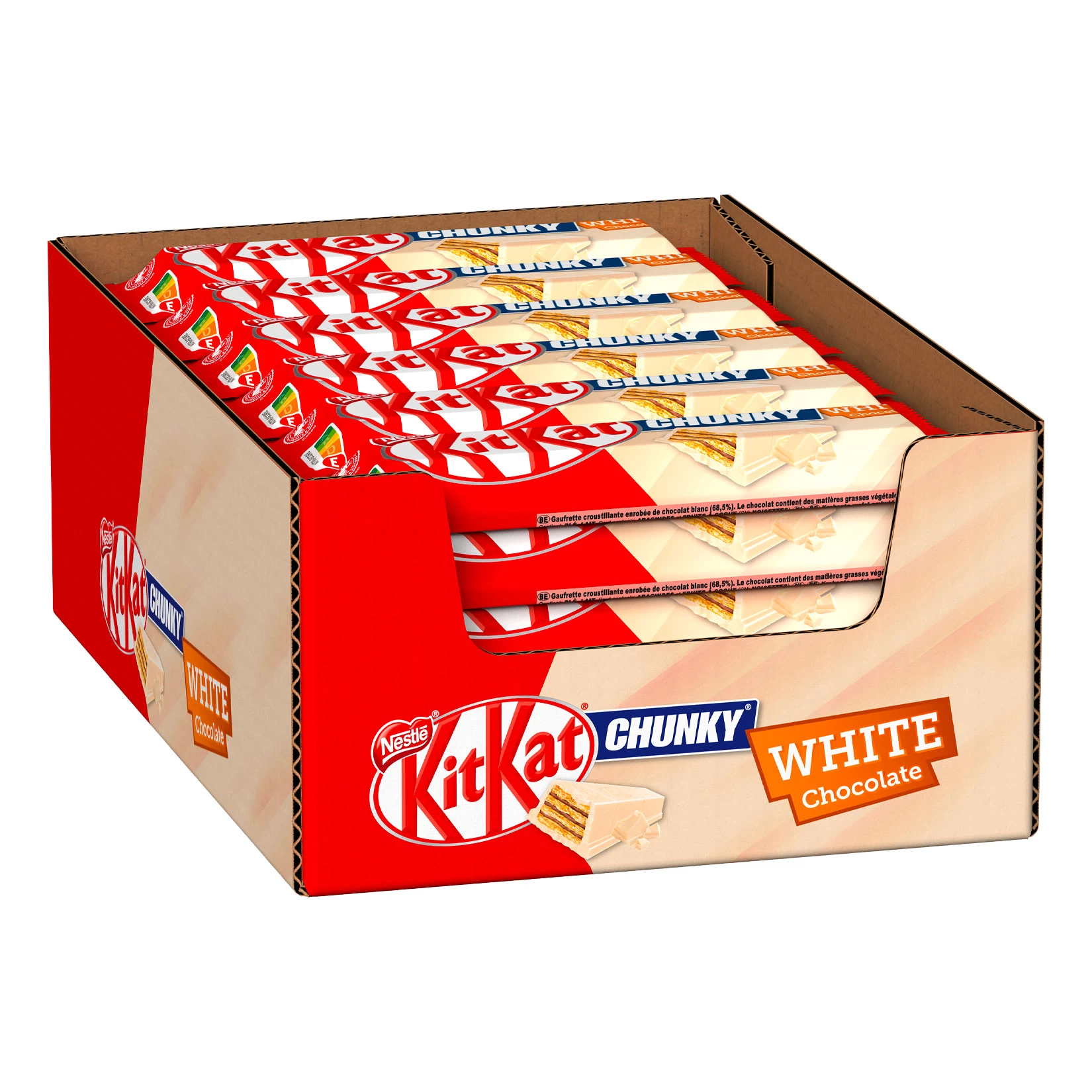 KITKAT ChunKy White ist der beliebte Schokoladen-Klassiker mit unwiderstehlicher, weißer Schokolade – und zwar in extra groß. Durch die einzigartige Kombination aus zartschmelzender Schokolade und knuspriger Waffel kommen Fans von weißer Schokolade voll auf ihre Kosten. Das große Format von KITKAT ChunKy White macht ihn zum perfekten Begleiter für eine satte Pause, die den Akku wieder auflädt. Der praktische Multipack sorgt für ausreichend Vorrat. Knusprig zart Die knackig luftige Waffel von KITKAT ChunKy wird umhüllt von leckerer, weißer Schokolade. Diese perfekte Balance aus knusprig und zart schmeckt großartig und ist bestens geeignet für den großen Hunger zwischendurch!