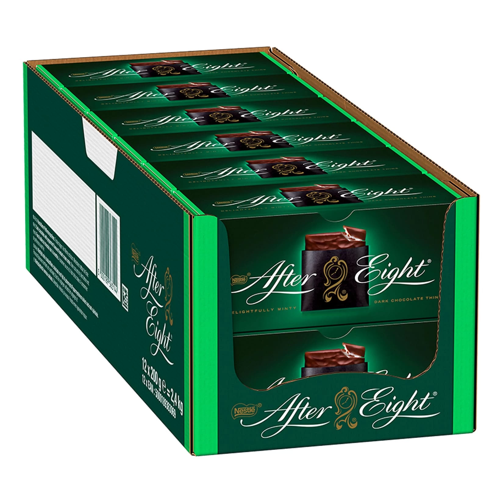 Hauchdünne Täfelchen mit einer zartschmelzenden Pfefferminzcremefüllung, umhüllt von feiner Zartbitterschokolade, das ist der beliebte Klassiker von AFTER EIGHT®. Ob tatsächlich „“after eight““ oder einfach mal zwischendurch – genießen Sie die feine englische Art! So erfrischend wie der englische Humor Die klassischen AFTER EIGHT® bieten Genuss vom Feinsten. Und das liegt vor allem an den erlesenen Zutaten. Die Herstellung jedes Täfelchens erfordert einiges an Raffinesse. Nur so schmilzt die schokoladige Erfrischung mit Pfefferminzcreme förmlich auf der Zunge. Das macht AFTER EIGHT® zu einem absoluten Geschmackshighlight für anspruchsvolle Genießer – im Sommer auch eisgekühlt!